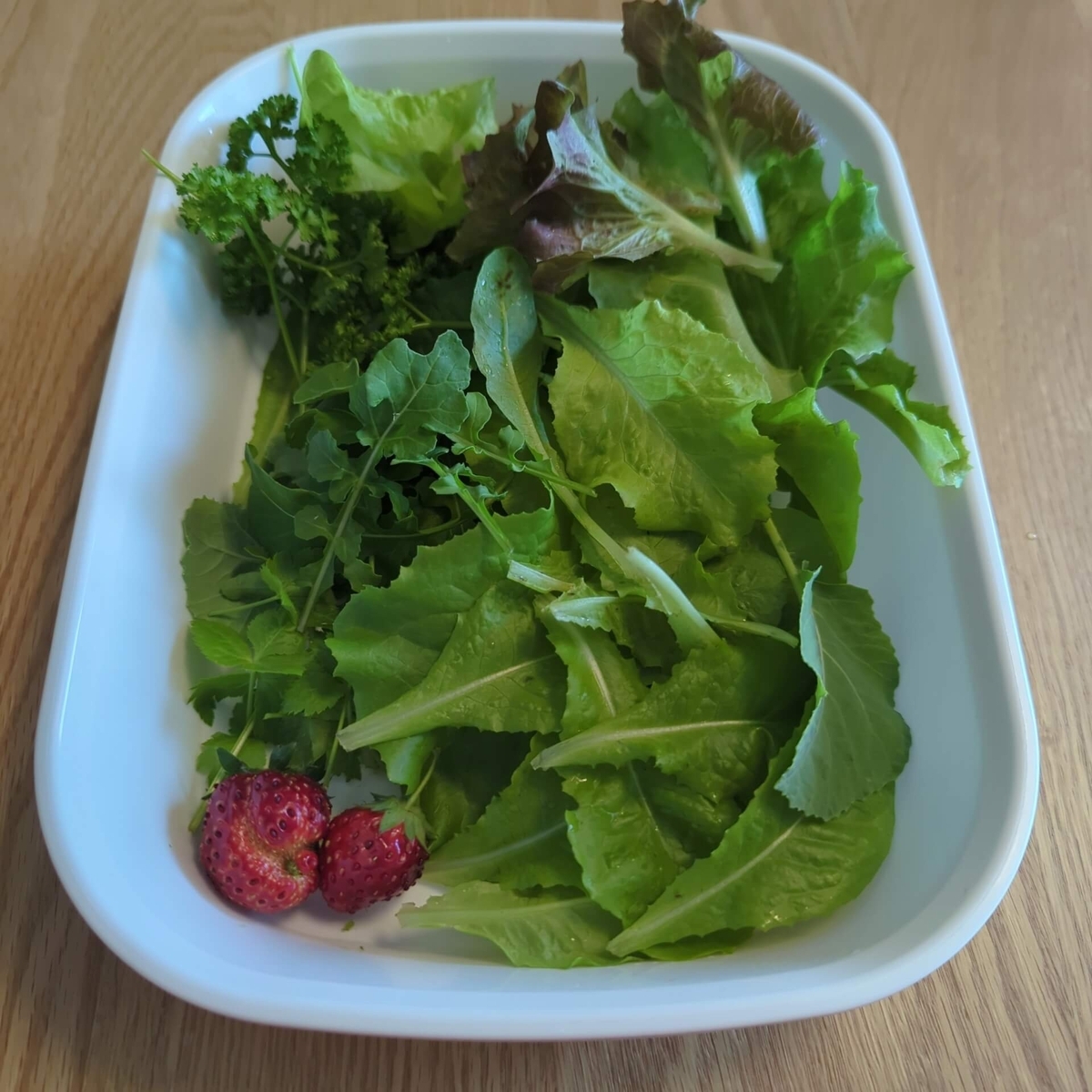 2025-06-07 ベランダ菜園の収穫(2025/6/7) 再生栽培 鉢栽培-日々の収穫 6月7日にベランダで収穫した野菜たちです。 リーフレタス、チマサンチュ、ロメインレタス、三つ葉、パセリ、ルッコラ、小松菜、ケール、イチゴです。 ロメインレタスが最もハダニ被害がひどくて、見る度にげんなりします。